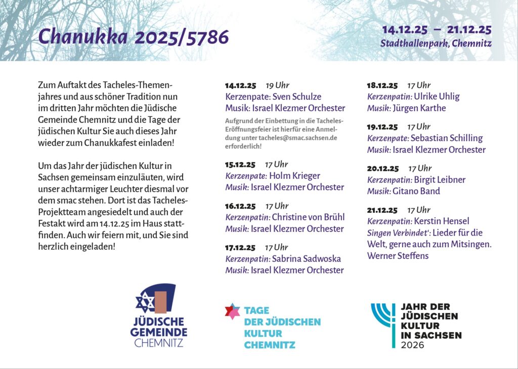 Zum Auftakt des Tacheles-Themenjahres und aus schöner Tradition nun im dritten Jahr möchten die Jüdische Gemeinde Chemnitz und die Tage der jüdischen Kultur Sie auch dieses Jahr wieder zum Chanukkafest einladen!